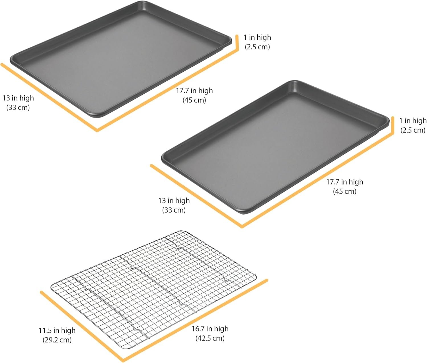 - Space-saving storage design: Set includes two half-sheet aluminized steel pans (17.75 x 13 x 1 in) plus a cooling rack (16.5 x 11.5 in), all stackable for easy cabinet storage.
