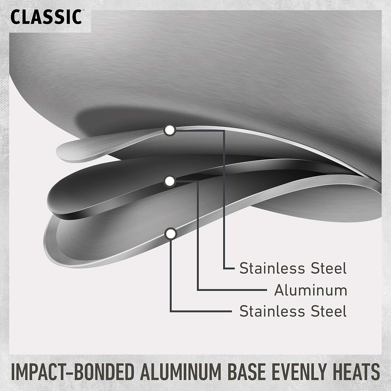 - Stainless steel construction with impact bonded aluminum base ensures even heat across fry pans, sauce pans, and stock pot.