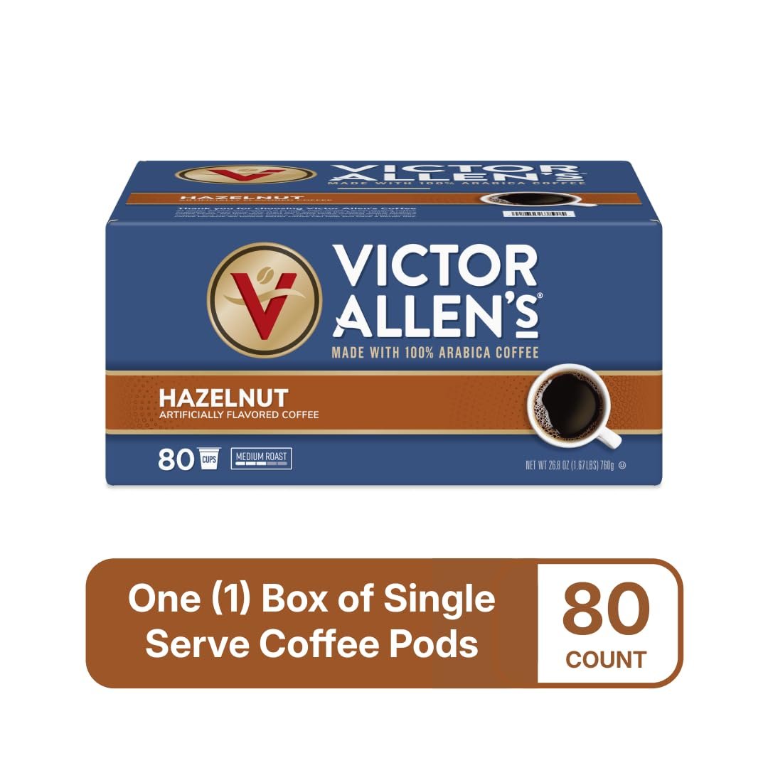 Indulge in the rich, nutty goodness of Victor Allen's Coffee Hazelnut Flavored Medium Roast Pods. This box contains 80 single serve coffee pods, crafted from 100% Arabica beans for a smooth and robust flavor profile. Perfectly gluten-free, non-GMO, and certified Kosher, these pods are compatible with all Keurig brewers. Whether you crave a sweet morning boost or a cozy afternoon treat, Victor Allen’s Coffee promises quality and taste that you can trust. Elevate your coffee experience today!