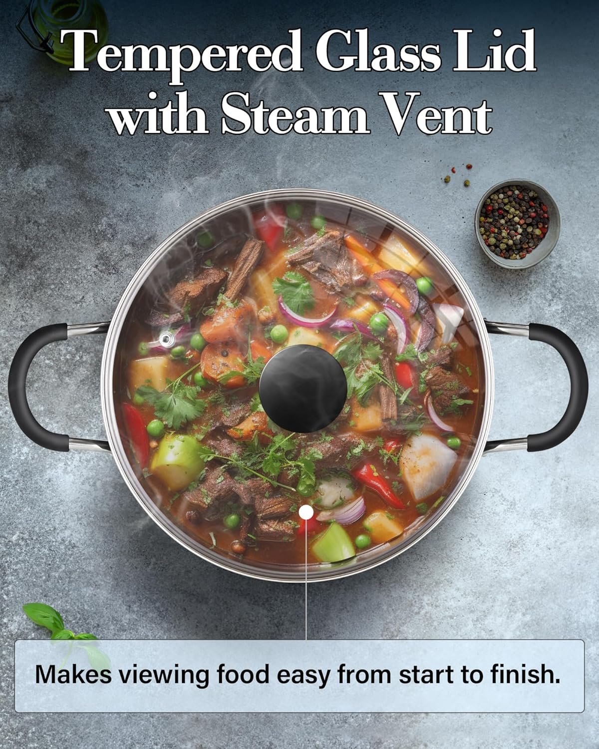 • Tempered Glass Lid: The included glass lid with steam vent ensures you can monitor simmering broths without losing heat or moisture.